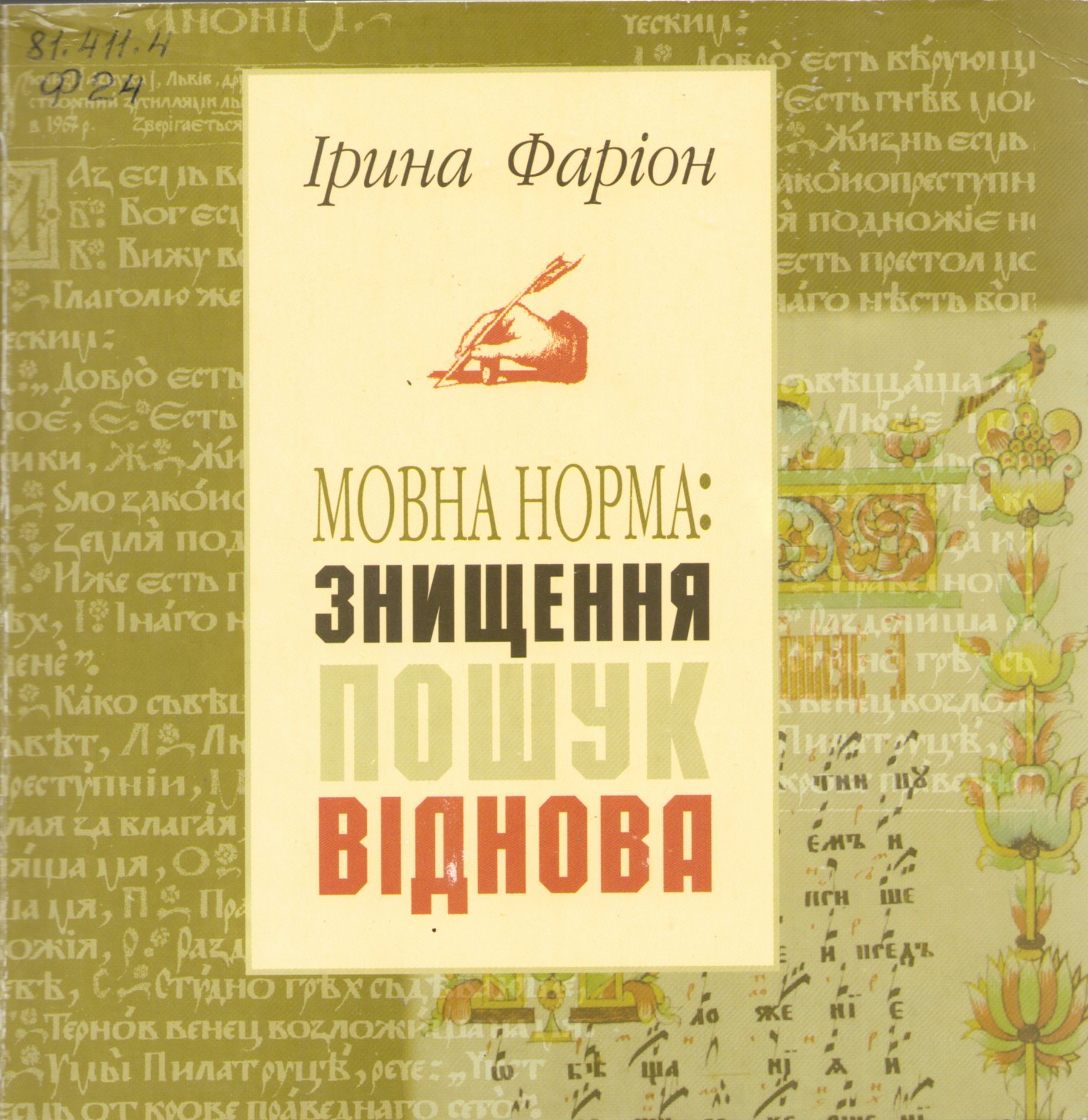 Фаріон І. Д. Мовна норма: знищення, пошук, віднова: культура мовлення публічних людей : монографія / Ірина Фаріон. – Вид. 2-ге, допов. – Івано-Франківськ : Місто НВ, 2010. – 336 с.